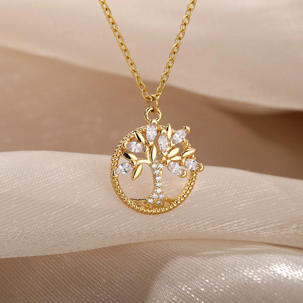 A radiant Tree of Life pendant symbolizing growth, strength, and new beginnings. Crafted in 18k gold-plated stainless steel and adorned with brilliant zircon leaves, this necklace adds a touch of timeless elegance to any look—perfect for gifting or everyday sophistication.